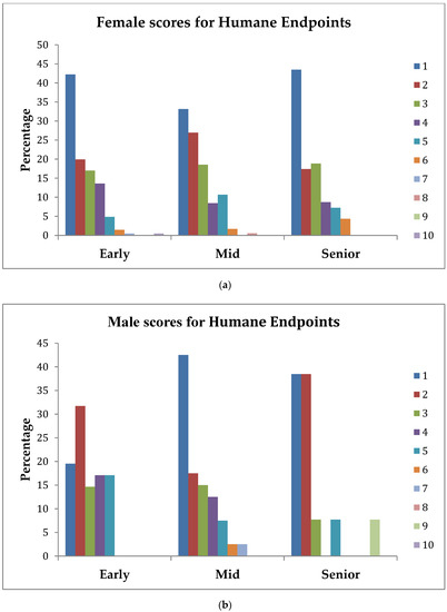 (a) Percentage of female students across stage-of-study rating the importance (1 = extremely important, 10 = least important) of an understanding of Humane Endpoints on their first day in practice; (b) percentage of male students across stage-of-study rating the importance (1 = extremely important, 10 = least important) of an understanding of Humane Endpoints on their first day in practice.