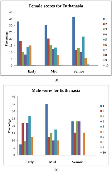 (a) Percentage of female students across stage-of-study rating the importance (1 = extremely important, 10 = least important) of an understanding of Euthanasia on their first day in practice; (b) percentage of male students across stage-of-study rating the importance (1 = extremely important, 10 = least important) of an understanding of Euthanasia on their first day in practice.