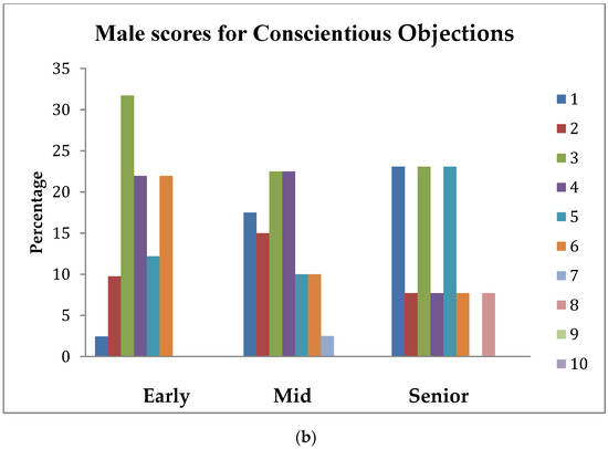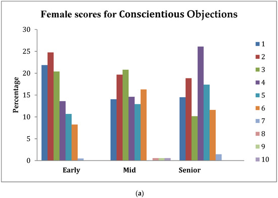 (a) Percentage of female students across stage-of-study rating the importance (1 = extremely important, 10 = least important) of an understanding of Conscientious Objections on their first day in practice; (b) percentage of male students across stage-of-study rating the importance (1 = extremely important, 10 = least important) of an understanding of Conscientious Objections on their first day in practice.