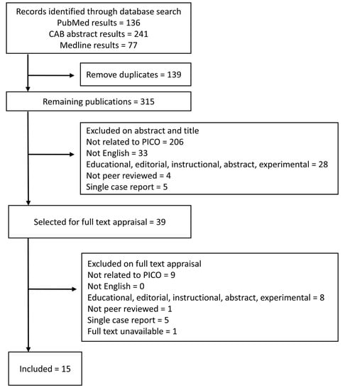 The inclusion criteria for publications were as follows: (1) relate to the treatment of naturally occurring PNG in dogs; (2) study design must be a case series (report of >1 case), case control, cohort, or controlled or uncontrolled trials; (3) be written in the English language; (4) be primary research; (5) be in a peer-reviewed journal accessible by the authors via the University of Nottingham or the British Library.