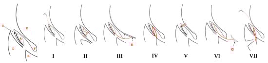Schematic representation of replacement techniques identified during a rapid review of the literature on PNG. (I) Morgan pocket; (II) Intranictitans tack; (III) Inferior scleral anchor; (IV) Periosteal anchor; (V) Perilimbal pocket; (VI) Ventral rectus anchor; (VII) Periosteal anchor combined with Morgan pocket. Surgical anatomy: A. third eyelid gland; B. ventral orbit; C. third eyelid cartilage; D. inferior palpebra; E. globe F. fornix; H. inferior sclera; G. ventral rectus; —suture o knot.
