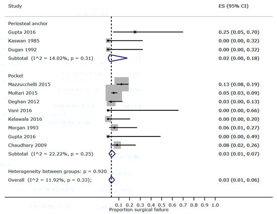 Surgical failure after replacement surgery from included studies from a rapid review of surgical interventions for PNG with proportional meta-analysis of publications reporting outcomes of the Kaswan periosteal anchor and Morgan pocket techniques; CI = Wilson score 95% confidence interval; ES = effect size (proportion surgical failure); I2 = Higgins’s heterogeneity statistic.