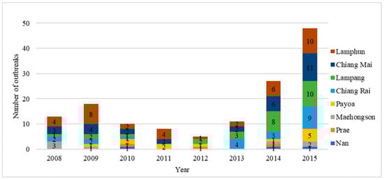 Livestock policy, including animal health, is enforced through nine DLD regional offices around the country. Northern Thailand is an important area for livestock production, especially pigs, dairy and beef cattle [,,], and includes eight provinces—Chiang Mai, Chiang Rai, Lamphun, Lampang, Payoa, Prae, Nan and Maehongson under the Fifth Regional Livestock Office of the DLD (Figure 1). During 2008–2015, a total of 140 FMD outbreaks were reported in these eight provinces (Figure 2). The Lamphun province had the highest number of outbreaks, followed by Chiang Mai and Lampang. The dry season in Thailand is September to January and is the high-risk season for FMD (Figure 3). A total of 101 outbreaks occurred on cattle premises, 22 occurred on premises that had cattle and buffaloes, 6 outbreaks occurred on buffalo premises, 6 outbreaks on pig premises and 4 outbreaks on premises that had both cattle and pigs. Only one of the reported FMD outbreaks in Northern Thailand was linked to a premise with a combination of cattle, buffaloes and pigs, which occurred in Maehongson province in 2008.