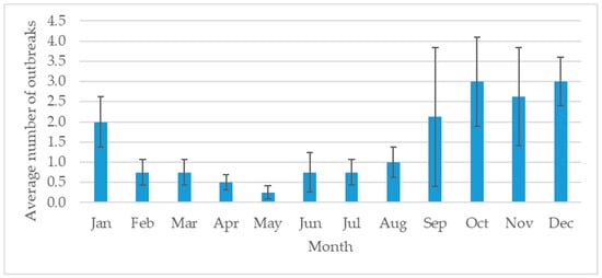 The average number of FMD outbreaks in eight Northern Provinces of Thailand, by month during 2008–2015.