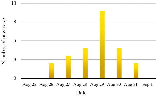 The incidence of FMD cases on an infected dairy farm in Chiang Mai Province during 2008. A total of 24 of 51 cattle showed pathognomonic signs of FMD.