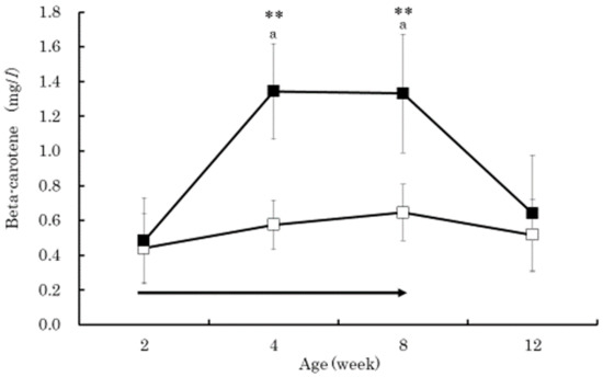 Changes in serum concentrations of beta-carotene in the BC group (dark square) and control group (empty square). Data are shown as mean ± SD. Arrow indicates beta-carotene supplementation period. Asterisks indicate a significant difference between groups at the same age (**: p < 0.01). Same lower case letters (a) indicate a significant difference from 2 weeks of age within the BC group (p < 0.01).