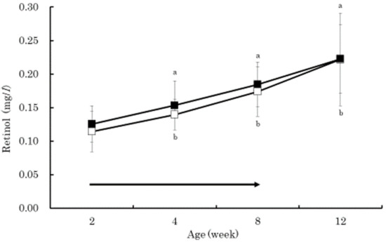 Changes in serum concentrations of retinol in the BC group (dark square) and control group (empty square). Data are shown as mean ± SD. Arrow indicates beta-carotene supplementation period. Same lower case letters indicate a significant difference in concentration when each group is compared to the concentration from 2 weeks of age within each group (p < 0.05).