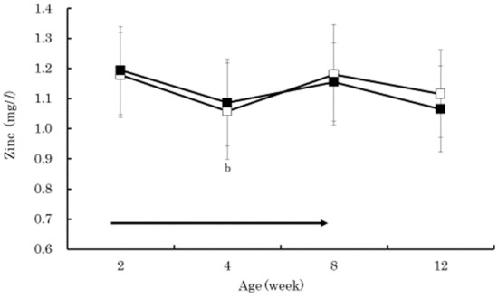 Changes in serum concentrations of zinc in the BC group (dark square) and control group (empty square). Data are shown as mean ± SD. Arrow indicates beta-carotene supplementation period. Lower case letters indicate a significant difference from 2 weeks of age within control group (p < 0.05).