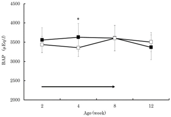Changes in serum biological antioxidant potential (BAP) in the BC group (dark square) and control group (empty square). Data are shown as mean ± SD. Arrow indicates beta-carotene supplementation period. Asterisks indicate a significant difference between groups at the same age (*: p < 0.05).