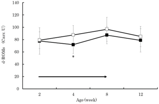 Changes in serum derivatives of reactive oxygen metabolites (d-ROMs) in the BC group (dark square) and control group (empty square). Data are shown as mean ± SD. Arrow indicates beta-carotene supplementation period. Asterisks indicate a significant difference between groups at the same age (*: p < 0.05).
