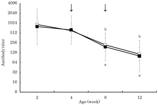 Changes in antibody titers to bovine respiratory syncytial virus in BC group (dark square) and control group (empty square). Antibody titers are shown as mean ± SD. Arrow indicates bovine respiratory syncytial virus vaccination. Same lower case letters indicate a significant difference in concentration when each group is compared to the concentration from 2 weeks of age within each group (p < 0.05).