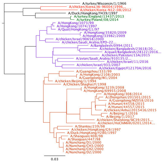 Phylogenetic tree of H9 hemagglutinin gene (Geneious 11.1.5). The four major poultry adapted lineages are color coded. Red-Korean lineage, Green-European lineage, Purple-G1, and Orange-Y280.