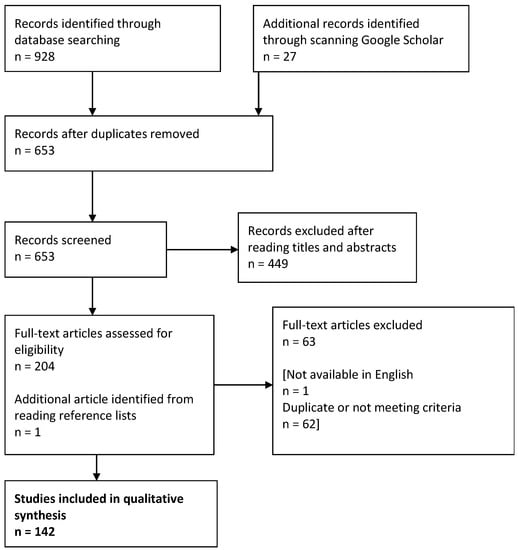 Figure 1 shows the process of refining the literature. In total, 142 results were obtained (full list accessible in Supplementary Materials, File S1). Information relevant to the research questions was extracted into a data-capture form (an example of which is accessible in Supplementary Materials, Table S1) and imported into a Microsoft Excel spreadsheet for analysis.