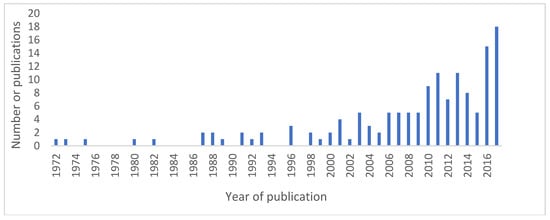 Publication dates ranged from 1972 to 2017, with an increasing number of papers published over time, as shown in Figure 2. This may reflect the increased awareness and interest in animal–human inter-relatedness, central to the One Health concept, and greater recognition of the value of sentinel surveillance.