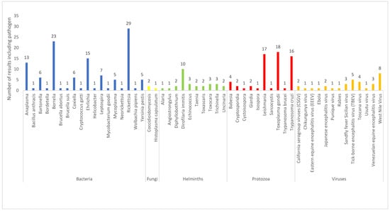 Within the 142 results, 53 pathogens were described related to current or potential use of dogs as sentinel animals. Figure 3 shows distribution of pathogens identified, organized by infectious-agent type. For the purposes of this review, results have been summarized and synthesized for key pathogens. Key pathogens were selected as those with a high number of results in order to provide a comprehensive review as to how dogs may be utilized as sentinels, and are limited in number due to the scope of the paper.