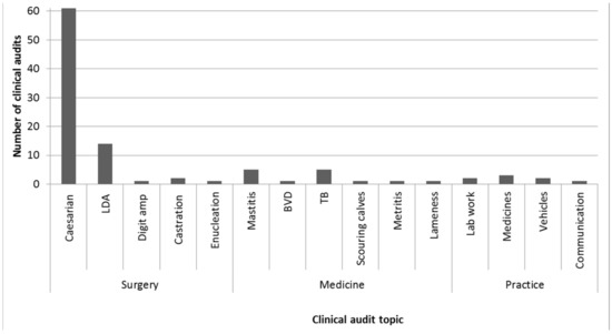 The topic of the most recent clinical audit conducted by the questionnaire respondents in a survey investigating the experiences and attitudes of UK farm animal clinicians towards clinical audit (n = 101). LDA = left displaced abomasum, Digit amp = digit amputation, BVD = bovine viral diarrhoea, TB = bovine tuberculosis.