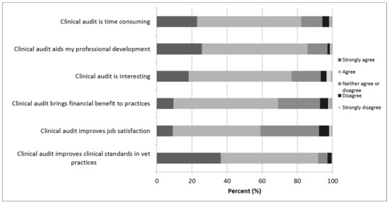 Attitudes towards clinical audit appeared to be generally positive (Figure 3). More than three quarters of respondents agreed with statements that clinical audit improved clinical standards in veterinary practice, aided their own professional development and that the process was interesting. There was slightly less agreement with the statement that clinical audit improved job satisfaction, with 33% (n = 70/210) neither agreeing nor disagreeing, and 83% (n = 173/210) of participants agreeing with a statement that the process was time consuming.