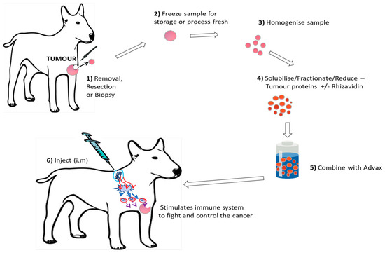 This autologous vaccine production protocol was tested and found to be safe in murine cancer models prior to starting this trial. Biopsied, resected or debulked tumor samples obtained from each individual patient were processed fresh or stored frozen at −20 °C until processed at laboratories at the University of Queensland or the University of Sydney. A minimum of 0.1 g sample was required and each sample was processed into the vaccine which produces four doses via the following method. For each 0.1 g of tumor, 1 mL of tumor buffer (50 mM Hepes, 0.15 M NaCl, 0.01% SDS pH 7.2) was added. The Tumor sample was then homogenized (Ultraturrax) to obtain a uniform suspension with no fragments of tumour remaining and then spun at 15,000 rpm for 5 min and the soluble lysate was collected. Soluble lysate contained between 5 to 30 mg of material per mL depending on the tumour type and origin. Dithiothreitol (DTT) was then added to a final concentration of 0.1 mM and 10 mg Advax™ was added per dose. Each final vaccine dose contained 0.2 mL Advax™ at 50 mg/mL with 0.2 mL of tumour lysate with or without 25 µg of rhizavidin and 0.01 mg/mL Thiomersal as a preservative. Prepared vaccine was stored at 4 °C until use. Murine studies later demonstrated no additional efficacy from the addition of the immune stimulant rhizavidin. To test if this was also the case for spontaneous canine tumors, approximately 50% of dogs received rhizavidin in their vaccine to compare safety and preliminary clinical outcomes. The rhizavidin used in this study was donated by Dr George Anderson (Naval Research Laboratory, Washington, DC, USA) and had an endotoxin level of less than 0.1 EU/mg.