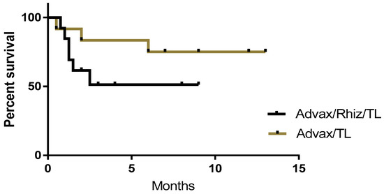 Survival curves comparing canine cancer patients vaccinated with autologous tumor lysate (TL) plus Advax™ adjuvant with or without rhizavidin (Rhiz). While the difference between groups is not statistically significant, there is a clear trend for the vaccine containing rhizavidin to be associated with shorter survival times.