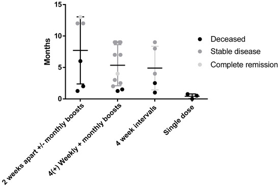 Survival comparison and outcome of different vaccine dosing schedules. No significant difference was seen between groups receiving either the weekly 4× with monthly boosts (n = 12) and monthly interval (n = 5) groups with 83% and 60% of patients being alive, respectively, at the time of the census. This compares to 50% in the second weekly group and 0% in groups that received a single dose (indicative of end stage terminal disease).