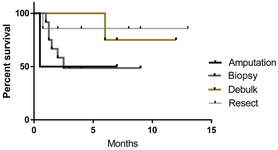 Survival curves of patients receiving biopsy, resection, debulking or amputation to collect sample. No significant difference was seen between groups, however, survival rates were 50% for amputation, 49% for biopsy, 75% for debulking and 86% for resectable tumors at the time of the census.