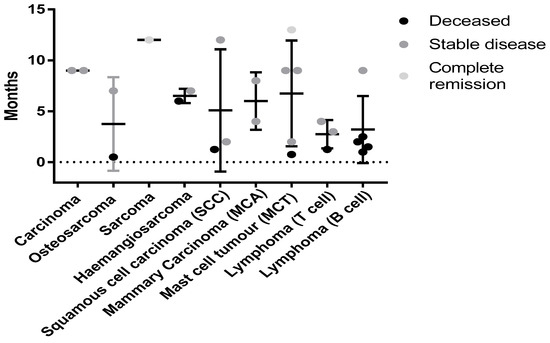 Status of canine patients with different neoplasms at the time of census. No significant difference was seen due to low numbers for each cancer type. Tumor types such as carcinomas (MCA and typical) had 100% survival with all patients having stable disease at the time of the census. Mast cell Tumors (MCT) may also be responding to this therapy with 80% of patients alive and one in complete remission (12 months from initial treatment) at the time of the census.