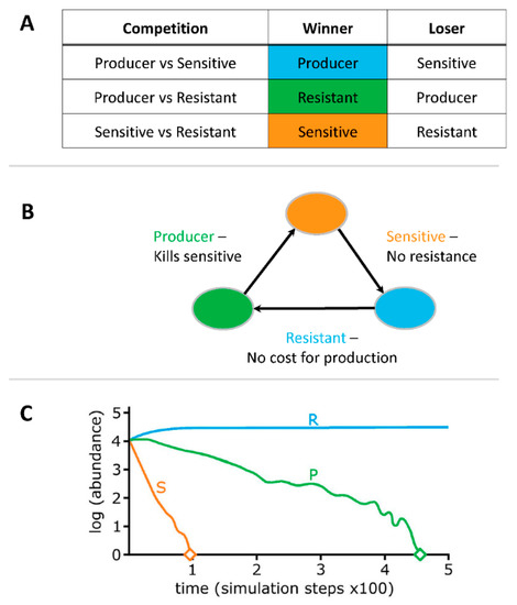 “Rock-Paper-Scissor” game of competition dynamics. Note: R = resistant, P = producer and S = Sensitive. Compartments (A), (B) and (C) are adapted from references [6,7,8], respectively.