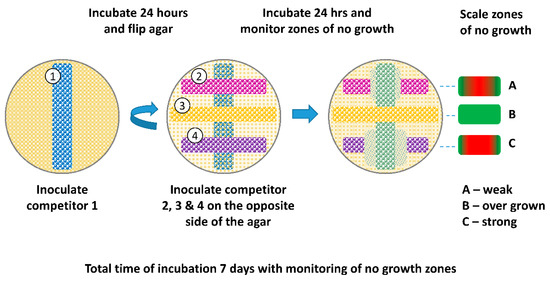 After overnight incubation, one competitor was streaked across a 4 mm MAC plate using a cotton swab. The hereinafter bottom strain was then incubated for 24 h at 37 °C. After 24 h, the agar was flipped and 3 strains were streaked perpendicular to the bottom strain and separated from the bottom strain by the thickness of the agar (Figure 2). Plates were then incubated for an additional 24 h at 37 °C and examined for zones of no growth directly over the bottom strain and graded using a scale of 1-to-10, with 1 being no growth over the bottom strain and 10 being full growth. Plates were incubated for an additional 6 days (7 days total) at 37 °C to monitor changes in zones of growth inhibition. A second trial was performed, as described above, with the following change: Agar thickness of MAC plates was increased to 7 mm and 10 mm and compared to the original 4 mm thickness.