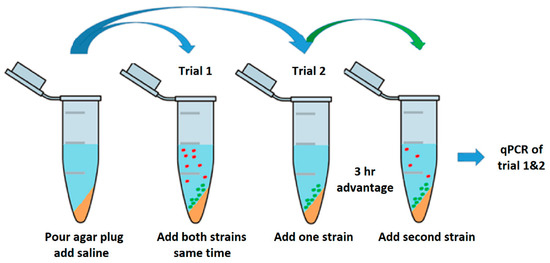 Schematic of Plug ‘n’ Prey. A 2 mL tube prepared with slants of 200 µL MAC agar. Slants were overlaid with 800 µL saline buffer (0.9%). In the first trial, overnight cultures were diluted to an OD 600 nm of 0.100 and grown to an OD 600 nm of 0.3–0.4 to ensure actively growing cells. Actively growing cells were diluted to a starting concentration of ~1000 cells and 100 µL of each competitor was inoculated at same time. The second trial was performed, as described, with the following change: One strain was inoculated 3 h prior to the competitor. Samples for both trials were taken at time points 0, 2, 4, and 6 days. Tube contents were divided into supernatant and slant and individually analyzed by qPCR monitoring copy numbers of O-serogroup specific gene fragment amplification.