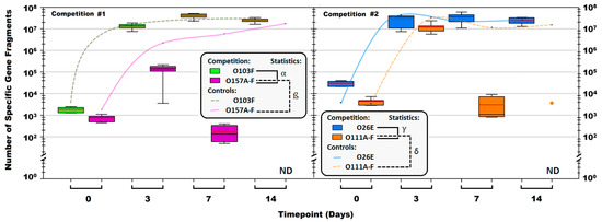 symbol denotes the O111B strain that was still present after 14 days. Symbols: α, β, γ, and δ denote a significant difference between: O103F and O157A-F in competition, O157A-F in competition and O157A-F controls, O26E and O111A-F in competition and O111A-F in competition and O111A-F controls, respectively (p < 0.05).