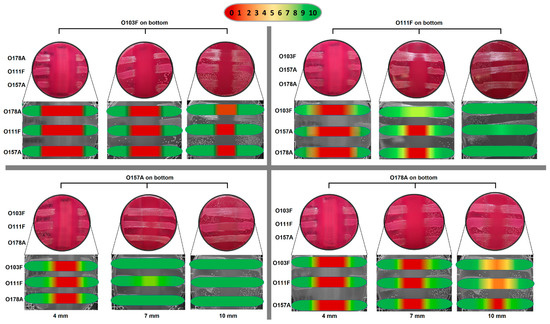 The 24 h semi-quantitative data from the second trial (four, seven, and 10 mm MAC plates) with O103F, O178A, O111F, and O157A demonstrated that at four mm agar thickness, all four strains had a strong zone of no growth and as agar thickness increased the size of the zones of growth inhibition varied by strain (Figure 5). O157A did not maintain a zone of no growth at seven mm and all three competing strains (O103F, O178A, and O111F) had solid growth when O157A was the bottom competitor. In comparison, O111F at 7 mm maintained the zone of no growth only for O157A and O178A, but not O103F. Both O178A and O103F maintained a narrowed zone of no growth at seven mm but at 10 mm thickness, O103F still maintained a zone of no growth for O111F and O157A and very limited growth for O178A. In contrast, O178A at 10 mm maintained the zone of no growth only for O157A with both O111F and O103F growing over the bottom O178A strain.