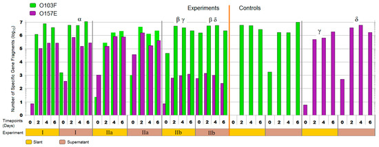 The total number of Escherichia coli O103F and O157E specific gene fragments in the supernatant and on the agar slant, across three plug ‘n’ prey experiments in comparison to the controls at each time point. Note: I = O103F and O157E added at the same time (bars side by side), IIa = O157E 3 h advantage over O103F (O157E bar on top), IIb = O103F 3 h advantage over O157E (O103F bar on top). Timepoint 0 is first time point after addition of both competitors. Symbols: α, β, γ, and δ denote a significant difference between: O103F and O157E in experiment I—supernatant, O103F and O157E in experiment IIb—slant and supernatant, O157E in experiment IIb and O157E control—slant and O157E in experiment IIb and O157E control—supernatant, respectively (<0.05).