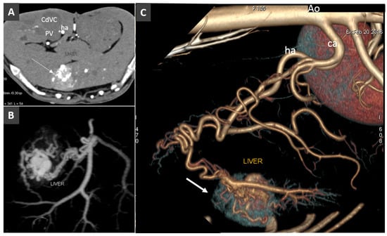 - Specchi, S.; Rossi, F.; Weisse, C.; Morabito, S.; Petrovitch, N.P.; Drees, R.; Thierry, F.; Ricciardi, M.; Penchome, R.; Armenise, A.; et al. Canine and feline abdominal arterioportal communications can be classified based on branching patterns in computed tomographic angiography. Vet. Radiol. Ultrasound 2018, 59, 687–696. [Google Scholar] [CrossRef] [PubMed]