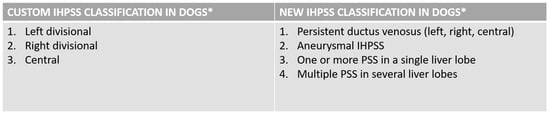 - Fukushima, K.; Kanemoto, H.; Ohno, K.; Takahashi, M.; Fujiwara, R.; Nishimura, R.; Tsujimoto, H. Computed tomographic morphology and clinical features of extrahepatic portosystemic shunts in 172 dogs in Japan. Vet. J. 2014, 199, 376–381. [Google Scholar] [CrossRef] [PubMed]