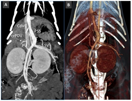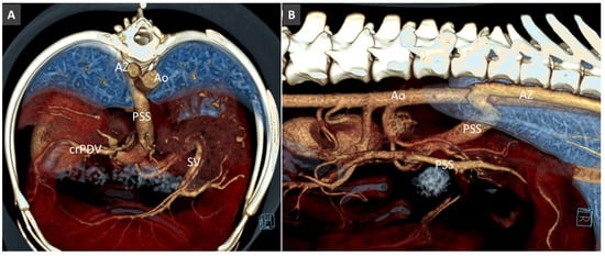 - Nelson, N.C.; Nelson, L.L. Anatomy of extrahepatic portosystemic shunts in dogs as determined by computed tomography angiography. Vet. Radiol. Ultrasound 2011, 52, 498–506. [Google Scholar] [CrossRef]