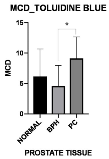 Total (periglandular/peritumoral and intraglandular/intratumoral) mast cell density (MCD) evaluated in Toluidine Blue-stained sections of normal, benign prostate hyperplasia (BPH) and prostate carcinoma (PC) samples. The graph shows an increased MCD in the PC group, compared to the other groups. The asterisk indicates significance (p = 0.033) of the comparison between BPH and PC.