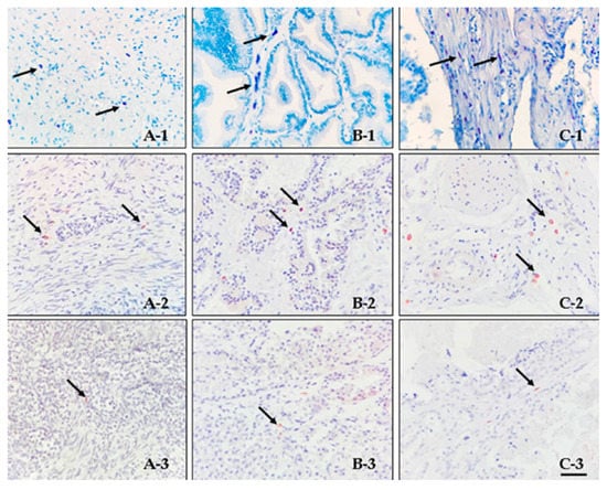 Mast cells (MCs) (indicated by arrows) in canine prostate tissues. (A)—normal; (B)—benign prostate hyperplasia (BPH); (C)—prostate carcinoma (PC). 1-Toluidine Blue (TB) staining: (A-1) Scattered MCs as single elements in normal periglandular stroma; (B-1) small groups of MCs in BPH intraglandular stroma; (C-1) numerous MCs detected in peritumoral stroma. 2-Tryptase immunostaining: scattered, trypase-positive MCs in periglandular and intraglandular stroma of normal (A-2) and BPH (B-2) samples, respectively, as well as in the peritumoral stroma of a PC case (C-2). 3-C-Kit immunostaining: scattered, c-Kit-positive MCs in periglandular and intraglandular stroma of normal (A-3) and BPH (B-3) samples, respectively, as well as in the peritumoral stroma of a PC case (C-3). No c-kit immunostaining is evident in prostate cells in each case. Bar = 50 μm.