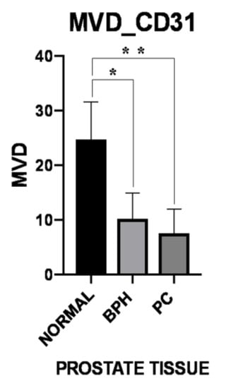 Microvessel density (MVD) based on CD31 immunostaining in prostate samples. The graph shows a significantly higher MVD in normal group, when compared with benign prostate hyperplasia (BPH) (single asterisk: p = 0.015) and prostate carcinoma (PC) (two asterisks: p = 0.003) groups.