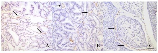 This study aimed to describe the distribution, tryptase and c-Kit immunoexpression, and the possible correlation with MVD of MC populations in canine prostate tissues. Many studies are available in the human literature investigating MC populations in various organs and tumors [17], with several researches concerning human prostate tissue [22,23,24,25,41,42,43]. In contrast, as far as the veterinary literature is concerned, only a few studies have been carried out in order to evaluate MC distribution and morphological features in normal organ and tissues [44,45,46,47,48], or to investigate MCD in neoplastic conditions [35,39,49,50,51,52], especially in relation to angiogenesis [35,47,51], and no information is available regarding prostate tissue.
