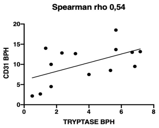 A significant positive correlation between MVD and tryptase immunostaining-based MCD was observed in BPH samples (ρ = 0.54 p = 0.041), whereas these parameters were not significantly correlated in normal and PC cases (ρ = 0.60 p = 0.314 and ρ = −0.45 p = 0.262, respectively) Figure 5.