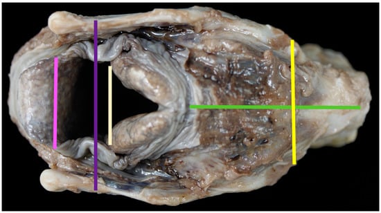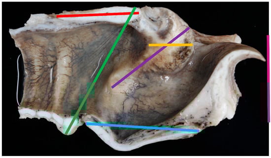 The ventral aspect of the larynx and measurements taken [Green line = measurement #1, red line = measurement #3, brown line = measurement #10].