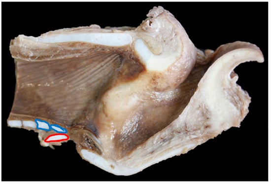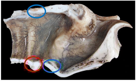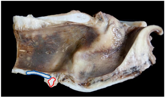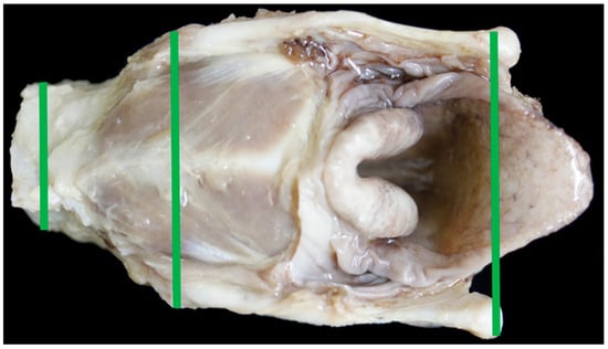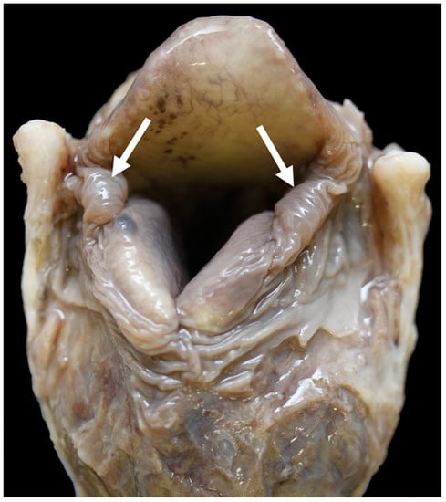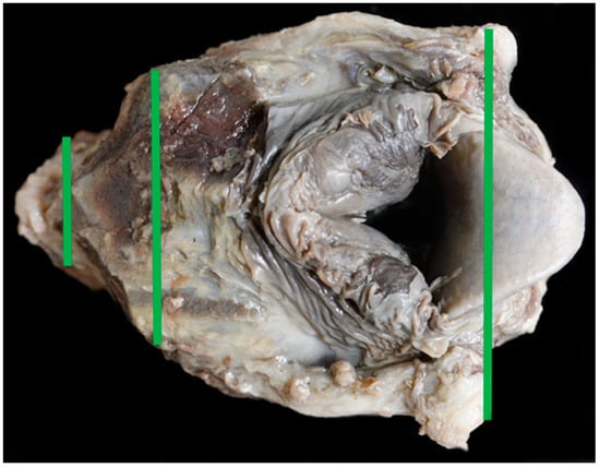 Overlap of the cricoid by the tracheal rings and varying lengths of the first tracheal ring retrospectively resulted in the tracheal measurements being taken at the level of the 2nd–4th tracheal ring. The amount of soft tissue around the larynx, especially in the space between the epiglottis and corniculate processes, and between the corniculate processes and the thyroid cartilages, varied between individual larynges. Generally, the BFL had very little excess soft tissue (Figure 11), but occasional BFL larynges showed a moderate excess (Figure 12).