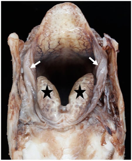 - Zrunek, M.; Happak, W.; Hermann, M.; Streinzer, W. Comparative Anatomy of Human and Sheep Laryngeal Skeleton. Acta Otolaryngol. 1988, 105, 155–162. [Google Scholar] [CrossRef] [PubMed]