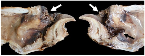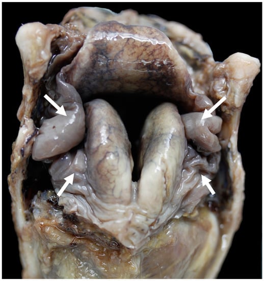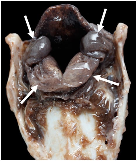 Massive bilateral necrosis of the corniculate process of the arytenoid cartilage (white arrows) with associated haemorrhage (black arrow) [TX13].