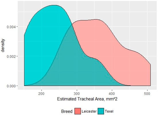 A density distribution of the tracheal areas for each breed measured at the 2nd–4th tracheal ring (mm2).