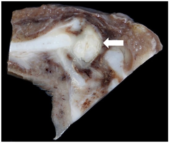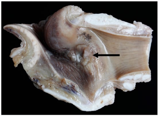 Medio-lateral slice through the left crico-arytenoid joint showing focally extensive abscessation (arrow) [TX9].