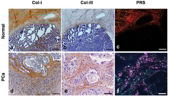 The immunohistochemistry and Picrosirius red (PSR) stain in normal tissue and canine PC. (a): immunostaining of Coll-I in the stroma of normal prostate (case No. 3). (b): immunostaining of Coll-III in the stroma of the normal prostatic tissue (case No. 3). (c): PSR staining observed in an optical microscopy with polarized light, the collagens fibers present red-orange birefringence (Coll-I) and green birefringence (Coll-III) in a smaller amount (case No. 3). (d): immunostaining of Coll-I in the stroma of prostatic neoplastic tissue (case No. 11). (e): immunostaining of Coll-III in the stroma of canine PC (case No. 11). (f): PSR staining in the canine PC with similar amounts of Coll-I and Coll-III (case No. 11).
