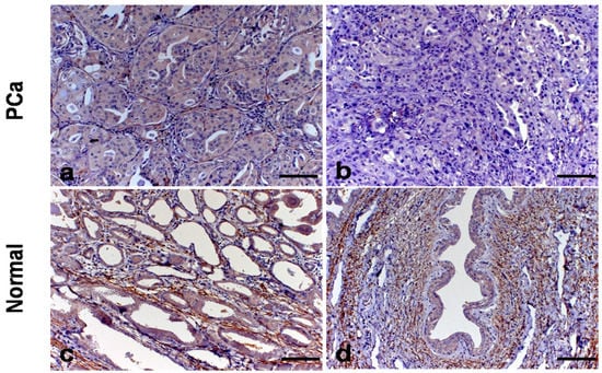 When BM, surrounding epithelial cancer cells, is lacking, it allows cancer cells to directly interact with stromal components, especially cancer-associated fibroblasts (CAFs), changing not only the tumor cell behavior, but also the cancer microenvironment [47]. Concerning Gleason grade and Coll-IV expression, tumors with higher Gleason grade (10) showed absence of Coll-IV compared to scores 6/8. Babichenko et al. [48] found that Coll-IV fibers disappeared with the increase of Gleason score. They also reported less Coll-IV immunoexpression in PC compared to PH.