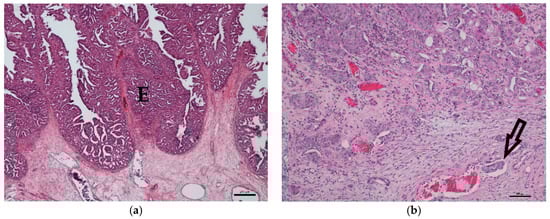 Histology of canine transitional cell carcinoma specimens. (a) Low-grade transitional cell carcinoma of an 11-year-old male mongrel. The epithelium (E) is markedly thickened and multi-layered, and the irregularly-arranged cells show mild anisocytosis and anisokaryosis. The basement membrane is intact (HE, bar = 250 μm). (b) High-grade transitional cell carcinoma of an eight-year-old castrated male mongrel with marked anisocytosis and anisokaryosis. The tumor intensively invades the submucosa, and additionally, an intravascular tumor cell embolus (arrow) is detectable (HE, bar = 100 μm).