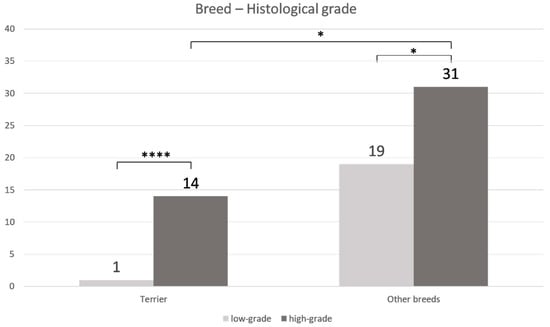 Correlation between histological grade and breed: A significantly higher percentage of high-grade transitional cell carcinoma (TCC) compared to low-grade TCC was observed in terriers (**** p < 0.0001) and in non-terriers (* p ≤ 0.05). Furthermore, a considerably higher percentage of high-grade transitional cell carcinoma was observed in terriers compared to non-terriers (* p ≤ 0.05) (Fisher’s exact test).